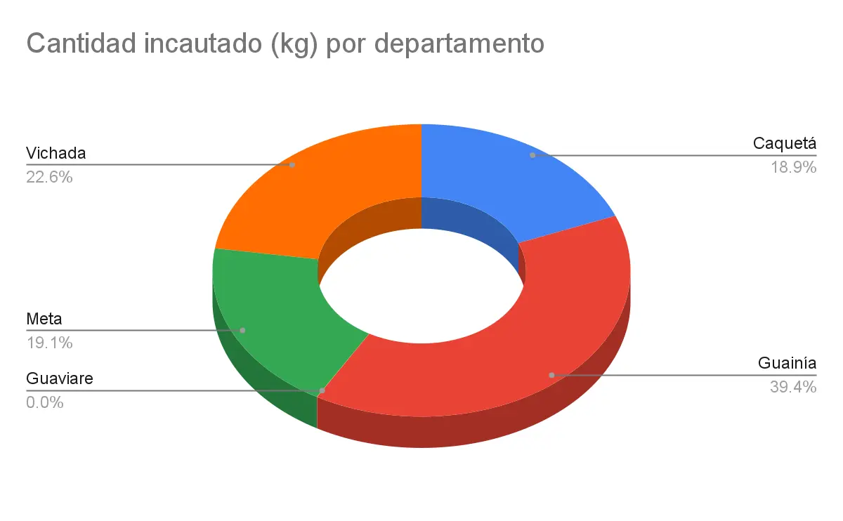 Inírida: Nodo Logístico y Centro de Acopio (Guainía) En segundo lugar, se ubica Inírida, capital del departamento de Guainía, con 4 operativos registrados (14.3%). Al sumar un procedimiento ejecutado en el sector cercano de Coayare (río Guaviare), este espacio geográfico acumula 5 incautaciones.