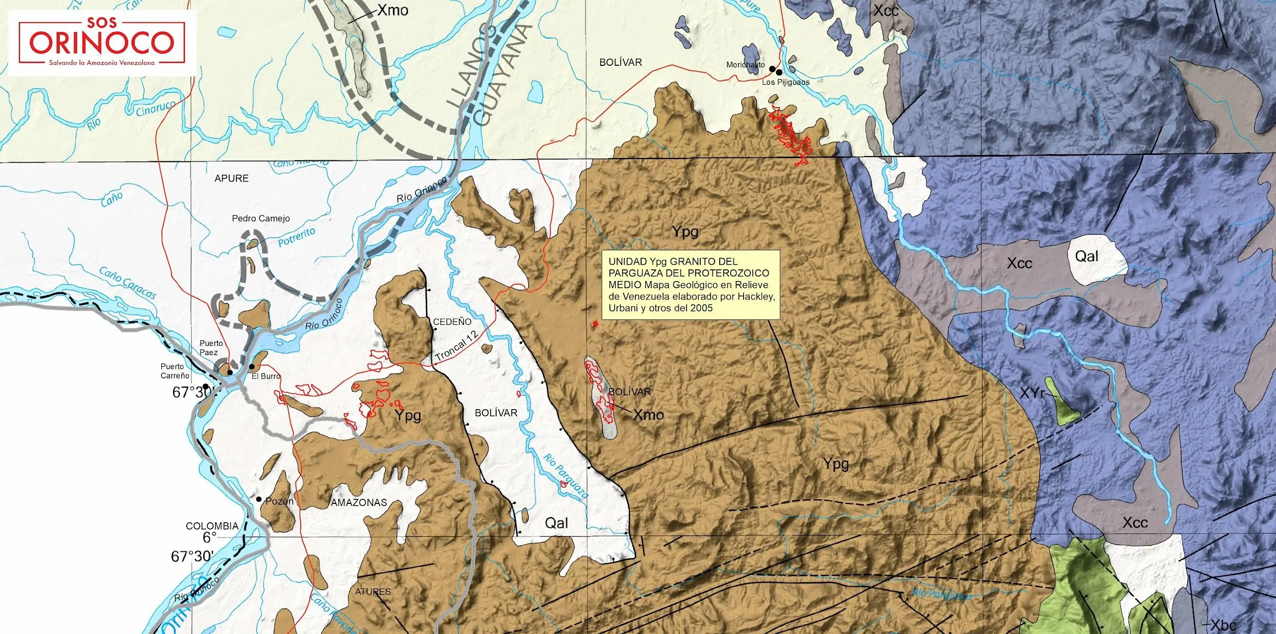 Nuestro análisis detallado de las imágenes satelitales permitió apreciar las características y el impacto ambiental de estas actividades (ver figura a continuación del 19/12/2023), destacando la desaparición de la cobertura boscosa, la remoción total del suelo con excavaciones profundas, la presencia de campamentos y estructuras con piscinas mineras. Geológicamente, el área está constituida sobre el Granito Rapakivi del Parguaza, una roca ígnea intrusiva del Proterozoico medio (Mapa de Geología de Urbani y otros 2005), cuya meteorización es capaz de producir niobio, tantalio (coltán) y otros minerales (Mariño 2025).