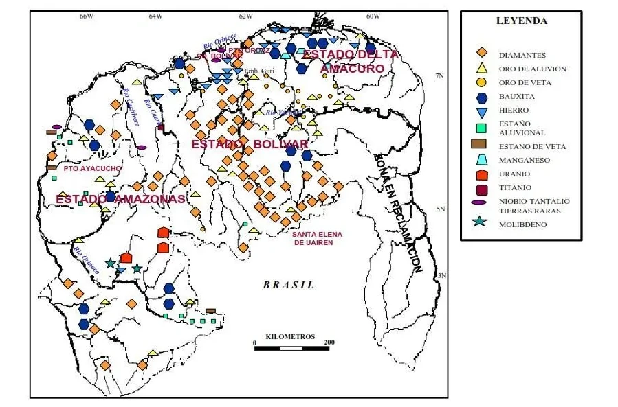 Reproducimos la figura 30 del trabajo de Mendoza Sánchez en donde se observa la ubicación de los diferentes minerales en los estados Bolívar y Amazonas.