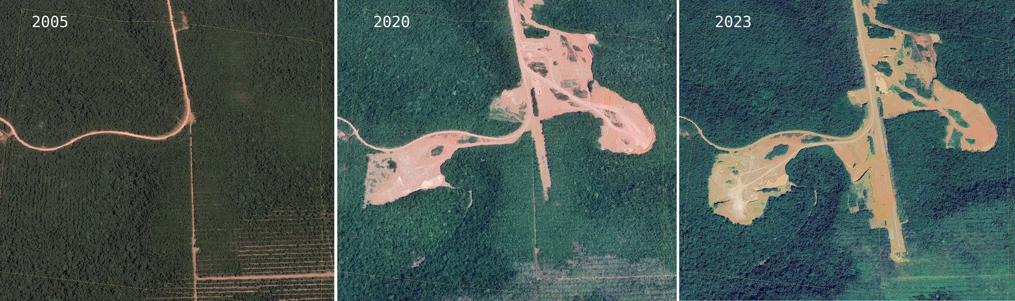 Según la denuncia, la actividad comenzó entre junio y julio de 2022. El análisis geoespacial revela la presencia de caminos, pozas y maquinaria en medio de la selva, en un área cuyo acceso requiere tres días de caminata desde el último punto transitable en motocicleta. Se trata de un terreno de alta complejidad que exige el uso de cuerdas para el desplazamiento de personal y el transporte de carga.