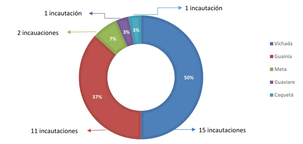 El Eje Estratégico de la Ruta 38 (Vichada). El tramo vial conocido como la Ruta 38 se consolida como el área con mayor recurrencia de operativos. Específicamente, en la jurisdicción del municipio Cumaribo (Vichada), se registraron 6 incautaciones de los 28 operativos con sitios identificados, lo que representa el 21.4% del total.