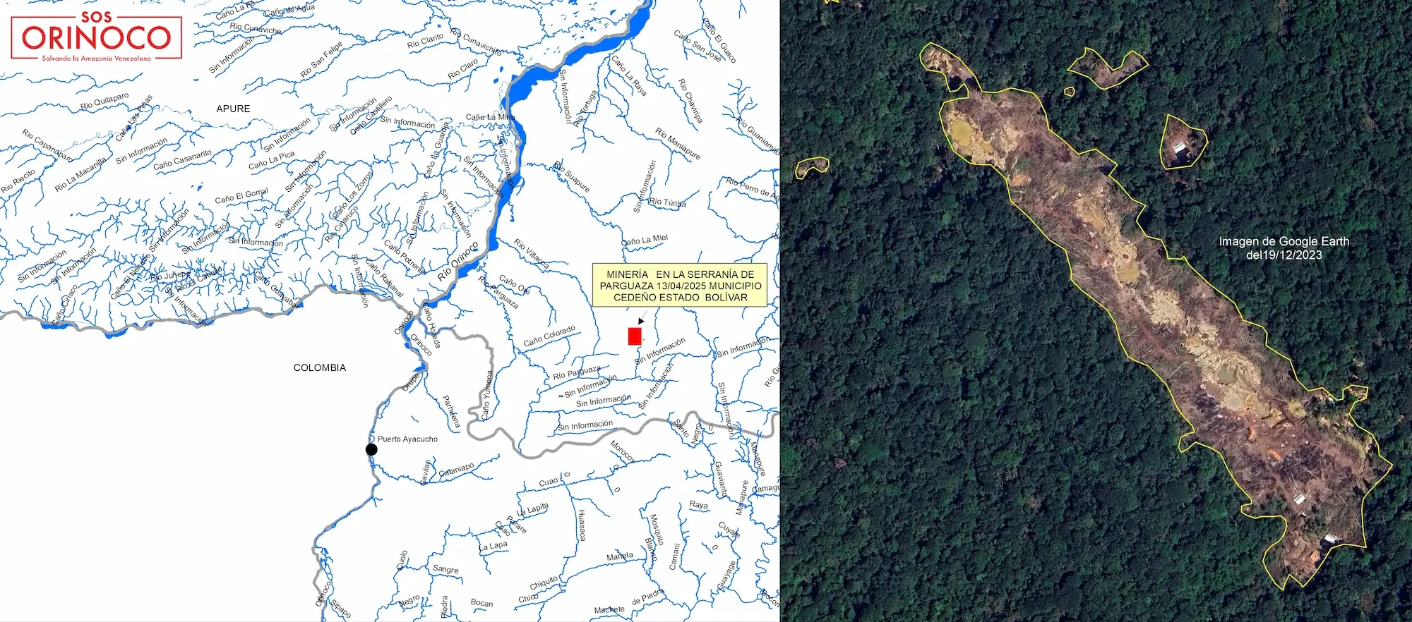 Ubicación del sitio de minería ilegal denunciado en la Sierra de Parguaza. Fuente: elaboración propia a partir de imágenes de Google Earth. La denuncia recibida por SOSOrinoco advierte sobre una operación minera ilegal en plena actividad, con indicios de organización logística internacional y explotación intensiva, señalando que: "A través del análisis satelital y la triangulación con fuentes humanas (…) se confirma la existencia de un centro activo de extracción de coltán, casiterita (estaño) y topacio. Las imágenes NDVI muestran pérdida de vegetación, mientras que los análisis SWIR y NDWI identifican cuerpos de agua artificiales y alteraciones de suelo compatibles con actividades extractivas".